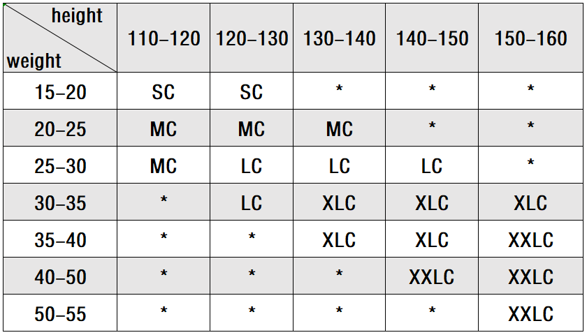 Size: SC, MC, LC, XLC, XXLC